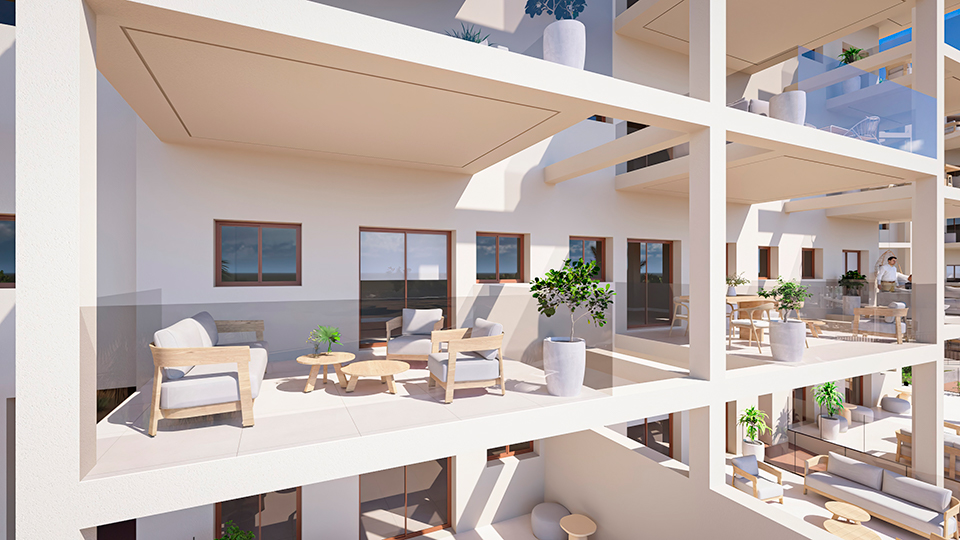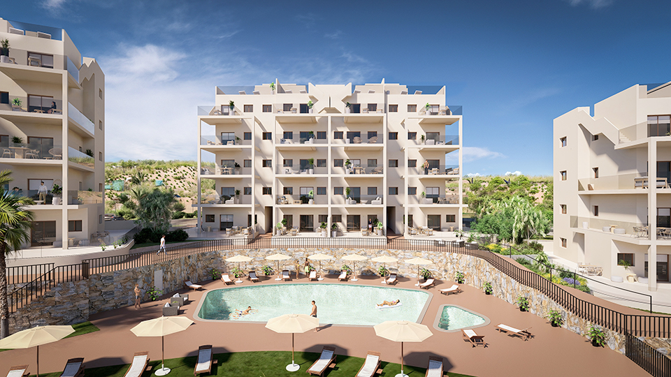 Imagine a place where you wake up each day to the simplicity of nature and the the charm of the Mediterranean. The pastel tones and the Mediterranean design of the Aneas apartments blend with the resort and the golf course and the Sierra de Carrascoy beyond.